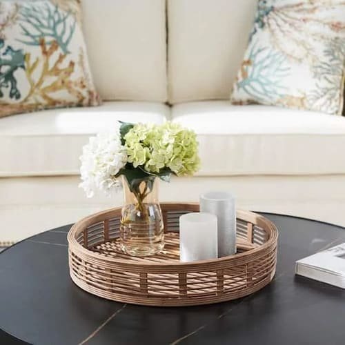 This Round Bamboo Decorative Tray – lightweight, natural, and perfect for organizing candles or hand soap.