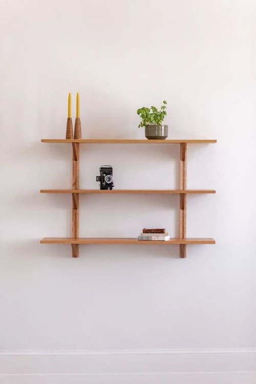 LEO Handmade Japandi Floating Shelf: Mid-Century Modern 3-Tier Solid Wood – made from light oak and simple brackets that echo Scandinavian design.