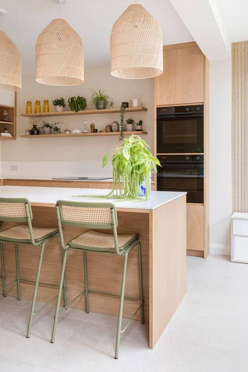 Rattan is like a cardigan for the kitchen; it makes it feel cozy right away.
