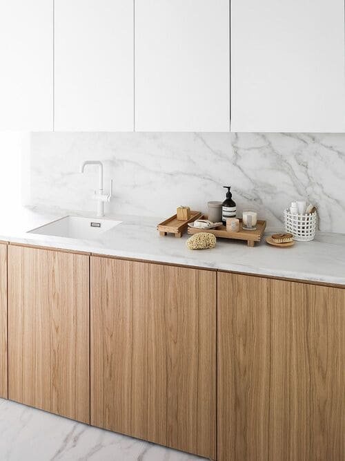 This mix always works. A little bit of marble makes it look classy, and wood keeps it real.