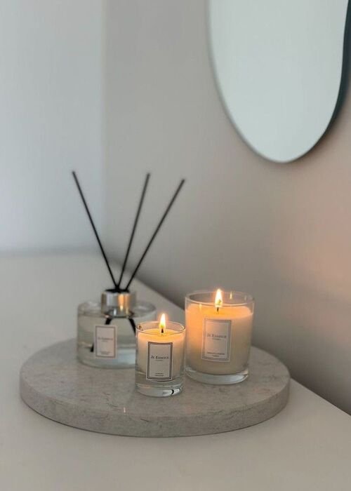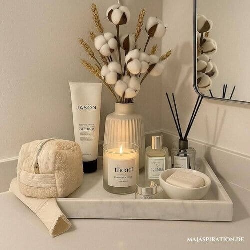 This little setup feels like my version of “instant calm.” I love how the candles and diffuser sit on that marble tray—super simple but still classy.