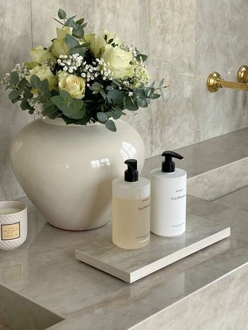 The huge cream vase with roses instantly softens the glossy marble, and the matching soap bottles make everything look intentional without trying too hard. If you want to recreate this vibe, keep the palette super tight—whites, soft greens, nothing loud.