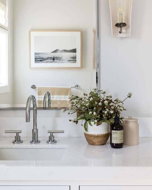 I like how everything stays low-key: just a bottle of soap, a sweet little vase, and a calm color palette.