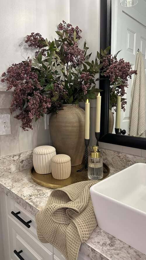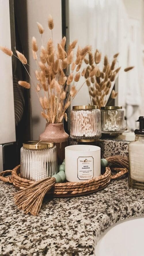 This setup leans rustic with the wood tones and dried stems. The little candle in the amber jar is a nice touch, too—it kind of warms up the whole counter.