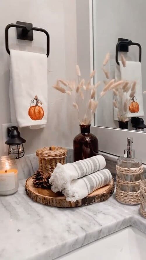 This one screams “fall but make it subtle.” The pumpkin towel, the wood slice tray, the brown bottle—it’s seasonal without looking like a craft store exploded. I dig how the rolled towels soften the whole look.