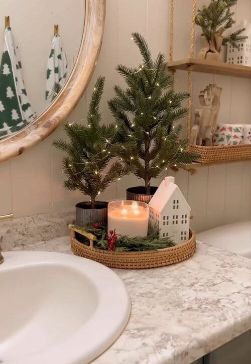 Honestly, this feels like the cutest tiny holiday village. The mini lit trees, the candle, the little white house—everything fits in one tray but still makes a statement.