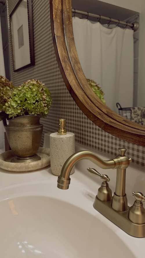 This counter has a more old-school charm with the brass faucet and the vintage-looking hydrangeas.