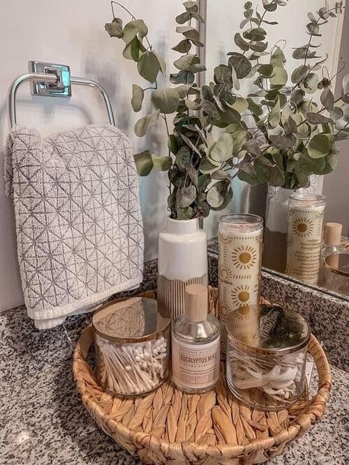 This one feels super real-life in the best way. A mix of eucalyptus, skincare staples, and little glass containers—all pulled into a woven basket so it doesn’t look scattered.