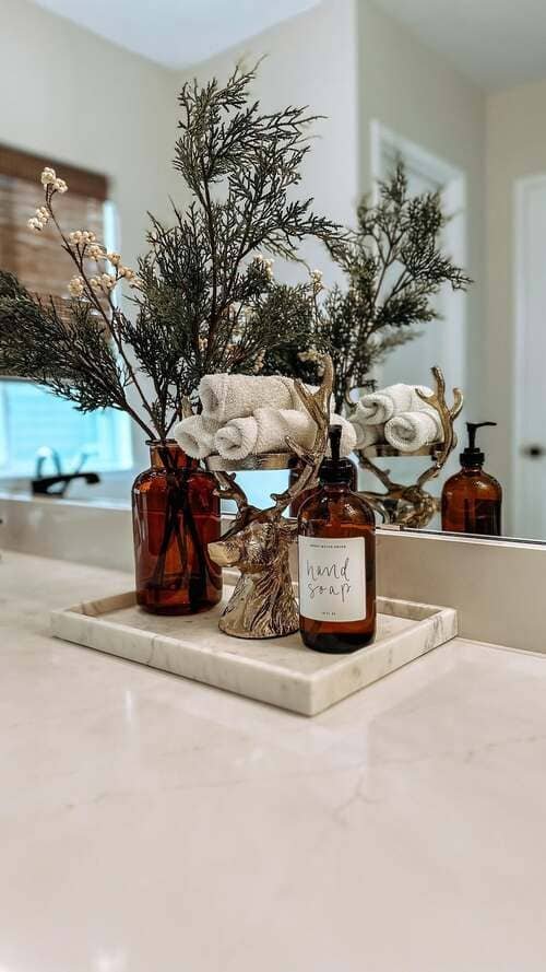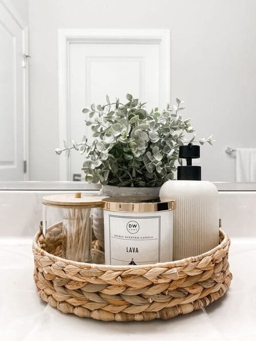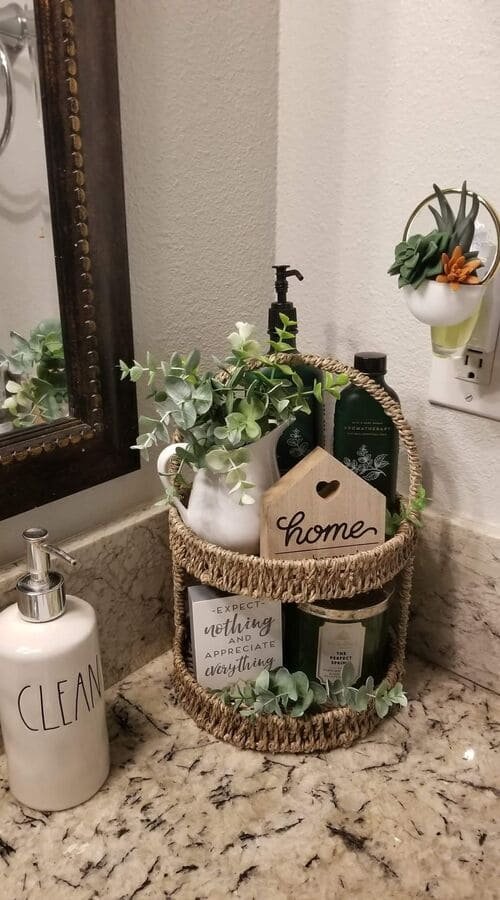 Honestly, you can’t mess this one up. A little basket, a plant, a candle, and a soap pump—that’s it.