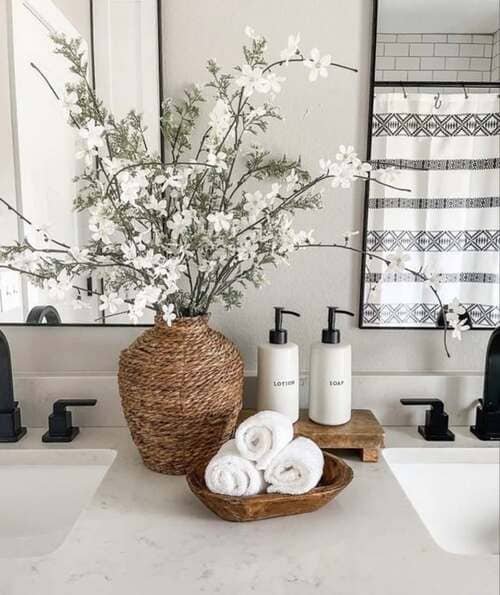 The woven vase is doing all the heavy lifting here, honestly. The white florals make the whole counter feel fresh, almost like a hotel bathroom but less perfect.