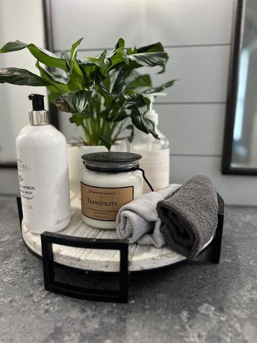 This tray is super functional but still cute. I like the little rolled towels next to the candle—simple but it works. The plant adds life without taking over.