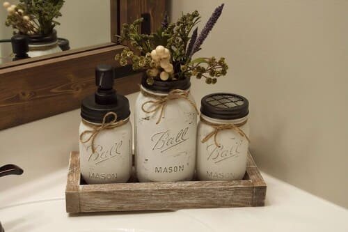 This is very farmhouse but still sweet. The painted mason jars look handmade in the best way, and I like how the tray keeps everything from floating all over the counter.