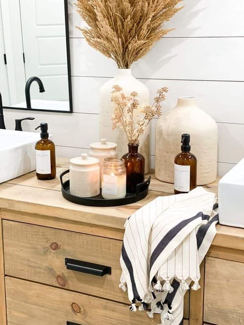 This countertop has that soft, almost spa-like vibe, mostly because of the warm woods and all the creamy candles. I like how casual it looks—like someone just placed everything down after cleaning.