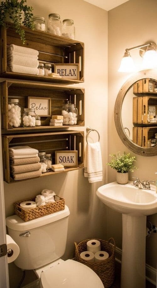 This setup feels like a tiny spa stuffed into a small bathroom, and honestly I love the warm, crate-style shelves.