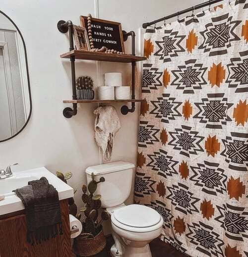 If you’re styling something like this, borrow two or three colors from your shower curtain so everything ties together without forcing a theme.