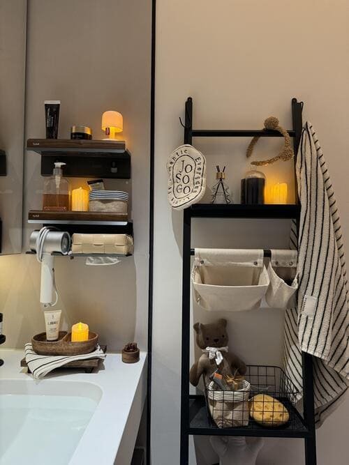 If you try this, add one warm light source—it hides the chaos and instantly makes the bathroom feel softer without needing to buy fancy décor.